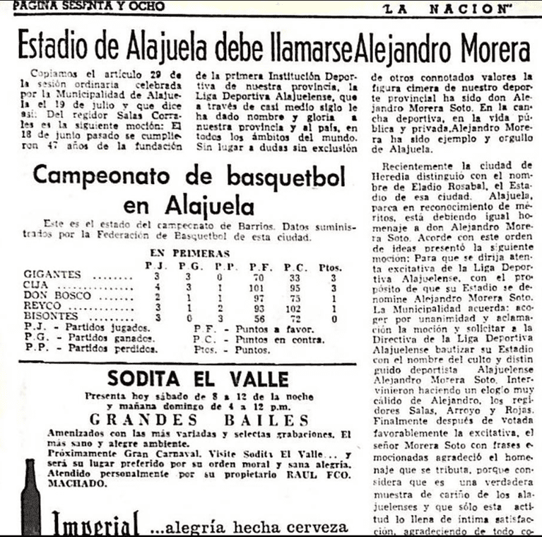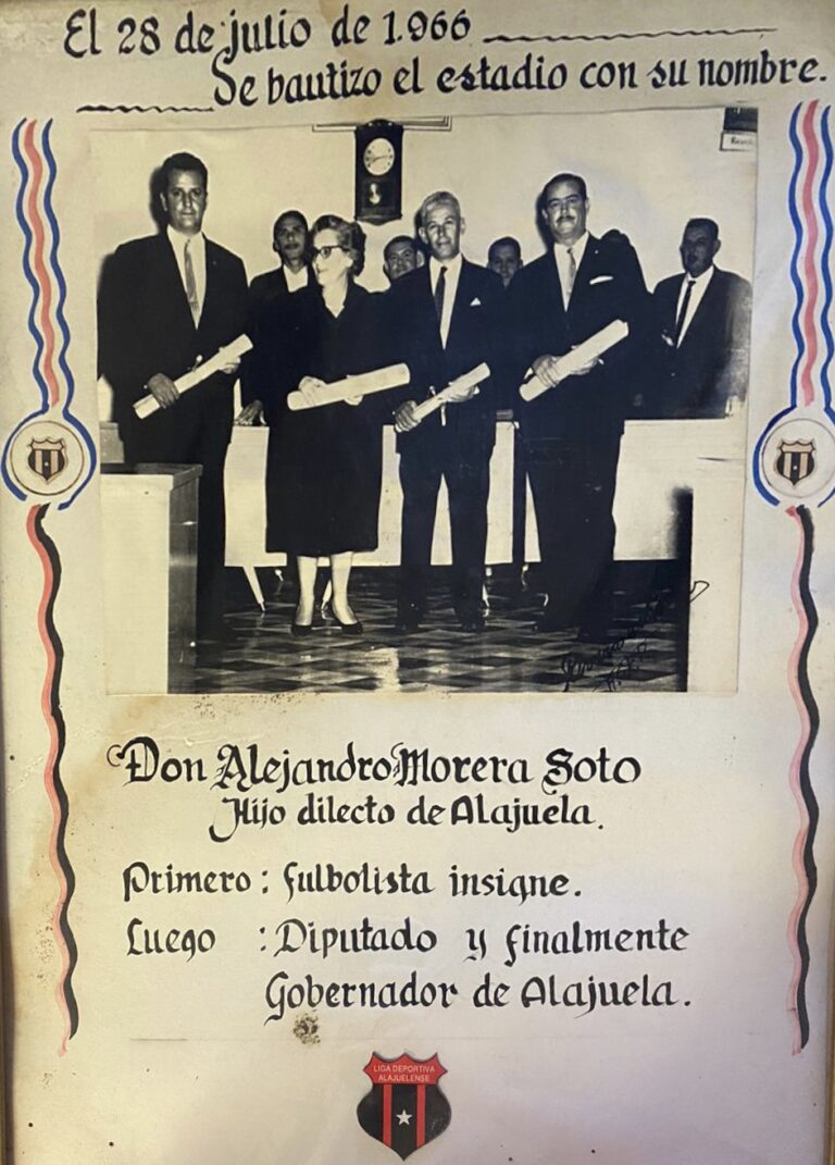 El 20 de julio de 1966 en la sesión ordinaria No 2776 de la Municipalidad, se acordó bautizar el Estadio Municipal con el nombre de Alejandro Morera Soto, en una sesión llevada a cabo por el presidente municipal César Rojas Ulloa y por el resto del Consejo presente.