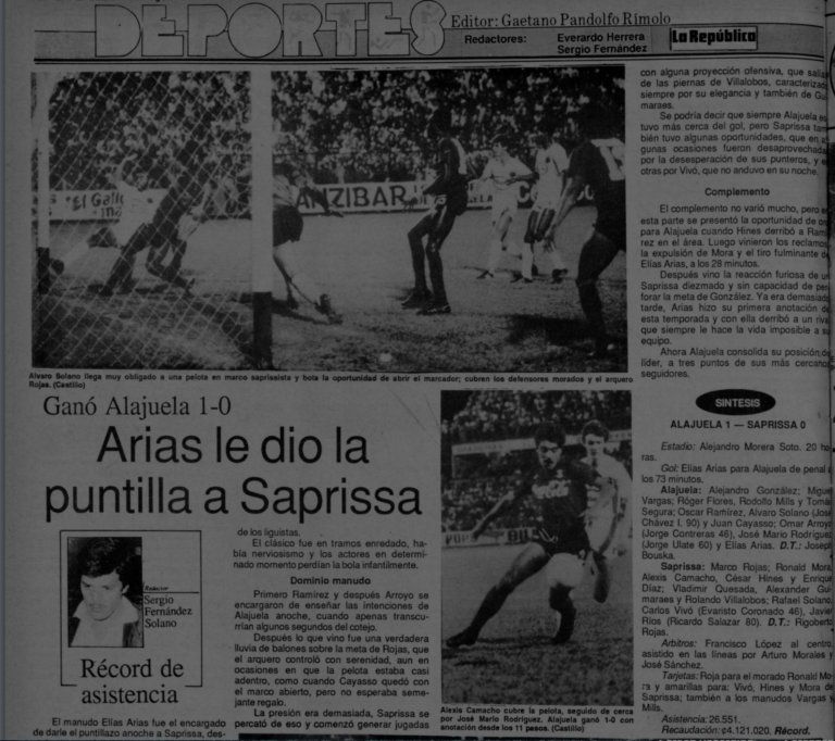 La mayor afluencia de público a un partido de fútbol fue durante un clásico contra el Deportivo Saprissa el 20 de diciembre de 1986, partido en el cual Liga Deportiva Alajuelense ganó 1-0 con un gol del jugador Elías Arias, la taquilla fue de ¢4 121 020 colones y entraron 26 551 aficionados.