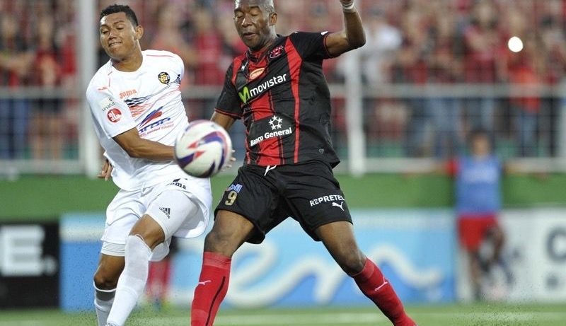 Jerry Palacios, autor de un gol, quitaba la marca del defensor de Puntarenas Roberto Wong (Foto: La Nación)