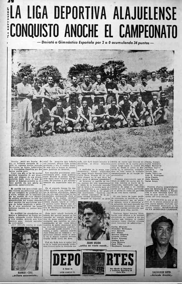 29 de octubre 1958: LDA suma su setimo título al ganar del campeonato de ese año. El encuentro final es ante la Gimnástica Española, donde destacó el delantero Juan Ulloa, quién anotó los 2 goles de la victoria alajuelense. Al término de las tres vueltas LDA suma 34 puntos. Nuevamente, el estratega del cuadro fue Salvador Soto el “Indio Buroy”, quien tenía al mando a figuras como Carlos Alvarado, Juan Ulloa y “Cuca” Herrera.