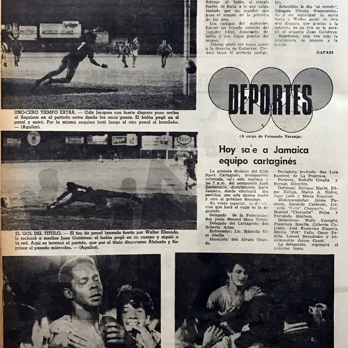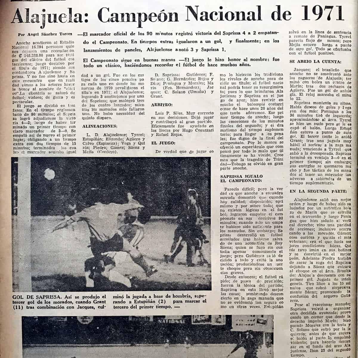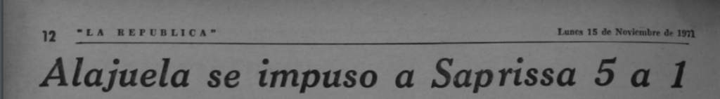 5 de diciembre 1971: Liga Deportiva Alajuelense se enfrenta por segunda vez al Deportivo Saprissa en la final del Campeonato Nacional. El primer juego se efectuó el 12 de diciembre con victoria liguista de 2 goles por 1 con tantos de Juan José Gámez y Alfredo Piedra. El partido de vuelta se desarrolló el 15 de diciembre. Al término de los 90 minutos, los "morados" consiguieron la victoria 4 goles por 2. Fue necesario recurrir a los tiempos complementarios de 15 minutos cada uno. Saprissa se fue arriba en el marcador con penal anotado por Odir Jacques. Alajuela reacciona y empata de cabeza por medio de Óscar Emilio Cordero. Esto obligó a definir al Campeón por la serie de penales. Ahí los manudos fueron efectivos y ganaron 3 goles por 1, para sumar el doceavo título. Este ha sido el primer campeonato que se define desde el punto de penal.