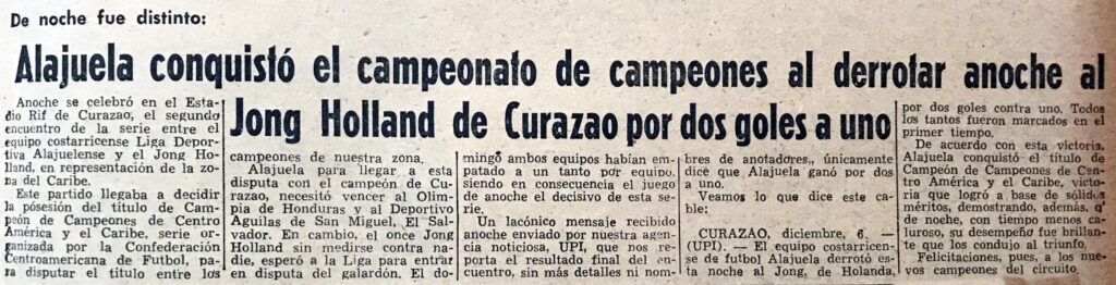 Esta edición del torneo contó con la participación de 5 equipos, 4 de centroamerica y 1 del caribe, todos ellos campeones en sus respectivas ligas, por lo que Alajuelense debió superar a lo mejor de la región en aquel entonces para ganar su primer titulo internacional de la historia. Se venció al Olimpia de Honduras, Águila de El Salvador y al Jong Holland en la finalísima.