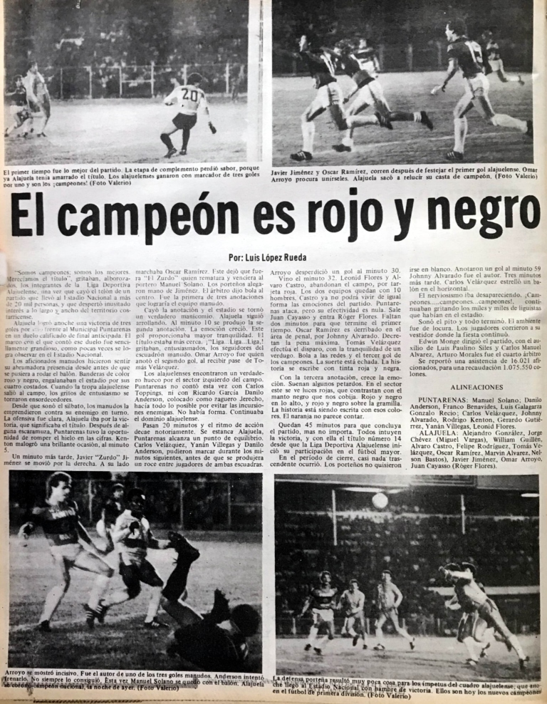 Es así como en el último juego de la segunda fase se enfrenta a Puntarenas en el Morera Soto. Alajuelense fue más y dio el paso al cetro con victoria contundente de 3 goles por 1, con anotaciones de Javier “Zurdo” Jiménez a los 6 minutos de juego, luego a los 11 Omar Arroyo logra el segundo tanto y cierra la cuenta para los rojinegros Tomás Velázquez en el cobro de un tiro de penal a los 43 minutos de la etapa inicial, tras falta que recibió Oscar Ramírez. El título 14 se ganó de la mano de Odir Jacques, quien llegó en sustitución de Max Villalobos.