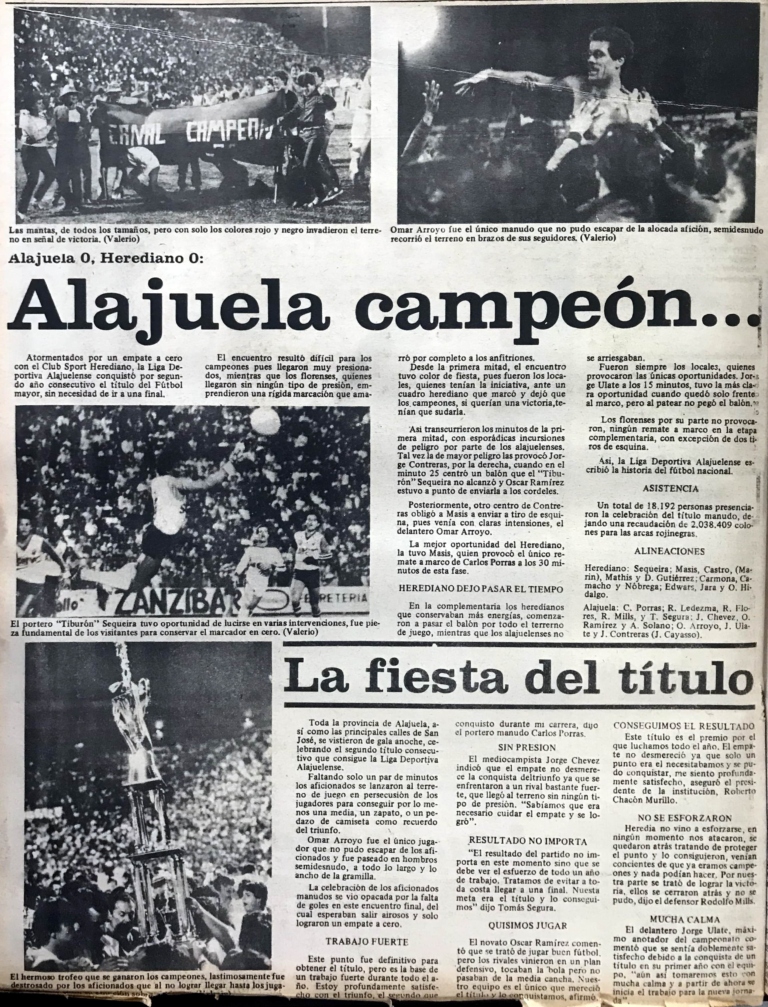 En el Estadio Alejandro Morera Soto, el miércoles 16 de enero de 1985 y con un empate a cero ante el Club Sport Herediano, alajuelense logró revalidar el título ante la presencia de 15 mil aficionados que celebraron el nuevo cetro.