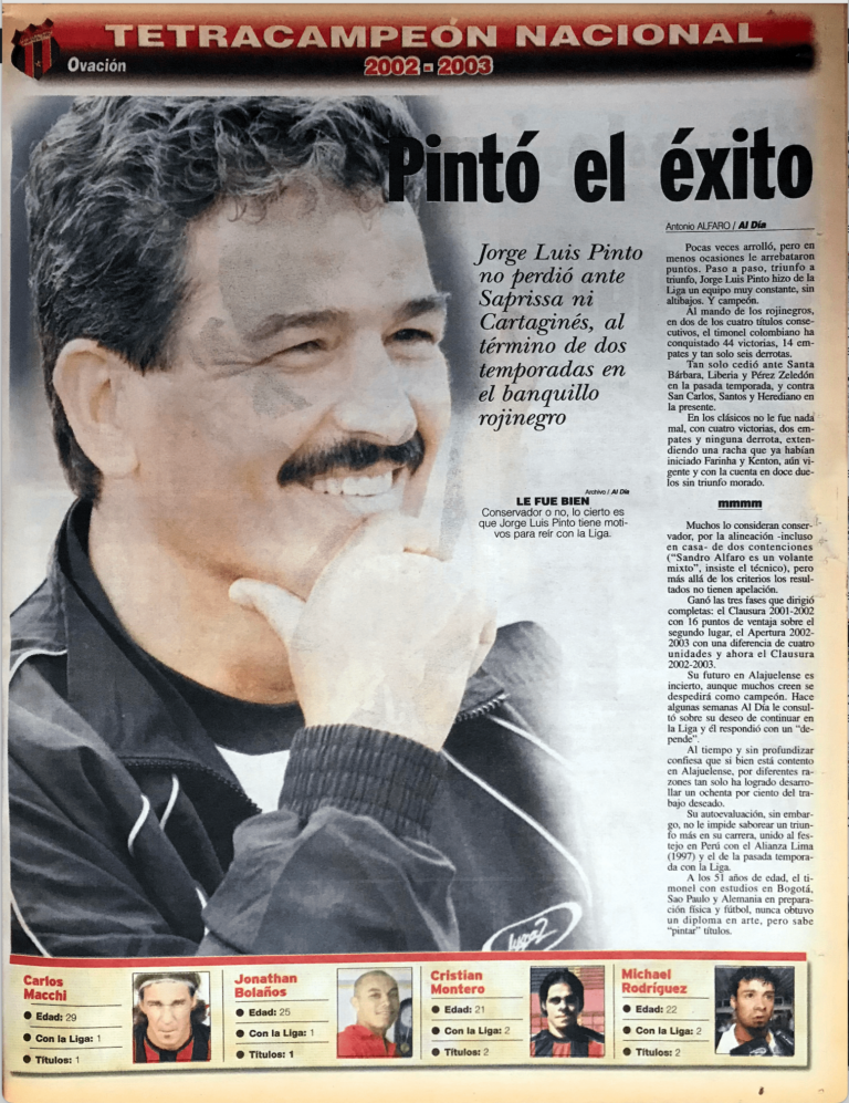 El triunfo a domicilio, el domingo 28 de febrero del 2002 ante el Deportivo Saprissa, con anotaciones de Rolando Fonseca despejaron cualquier interrogante que podía existir con en el trabajo del técnico Jorge Luis Pinto Afanador.