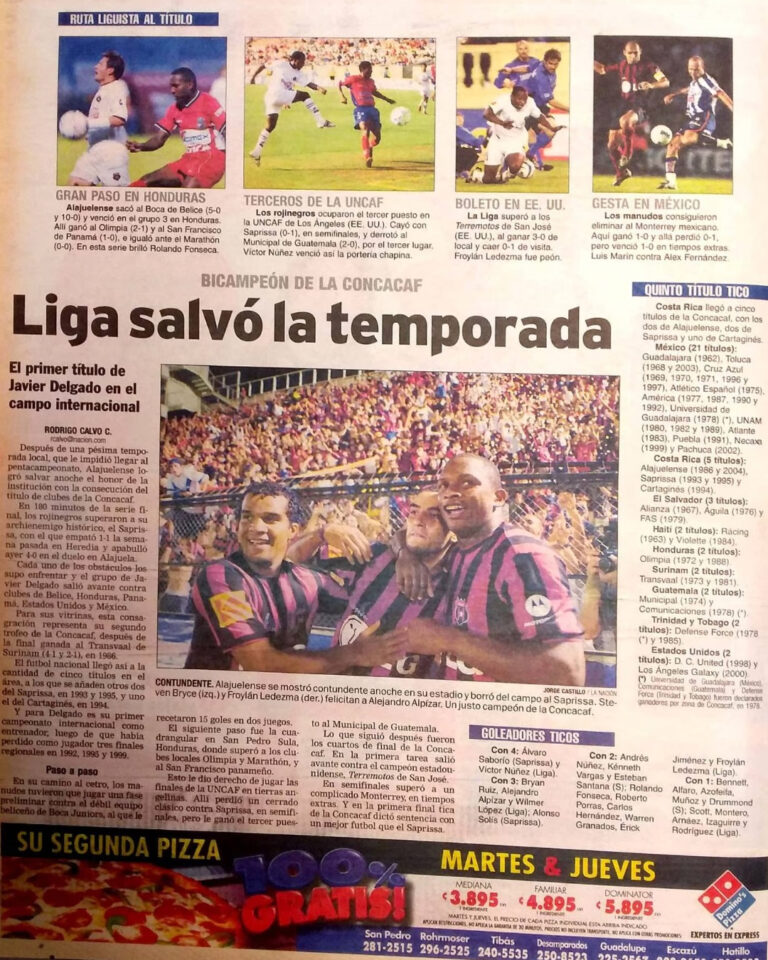 Por primera vez en la historia de la Copa de Campeones de la Concacaf, dos equipos costarricenses llegaron a la final y ahí LDA, bajo la dirección de Javier Delgado alcanzó el cetro, arrollando a su rival en el juego definitivo.