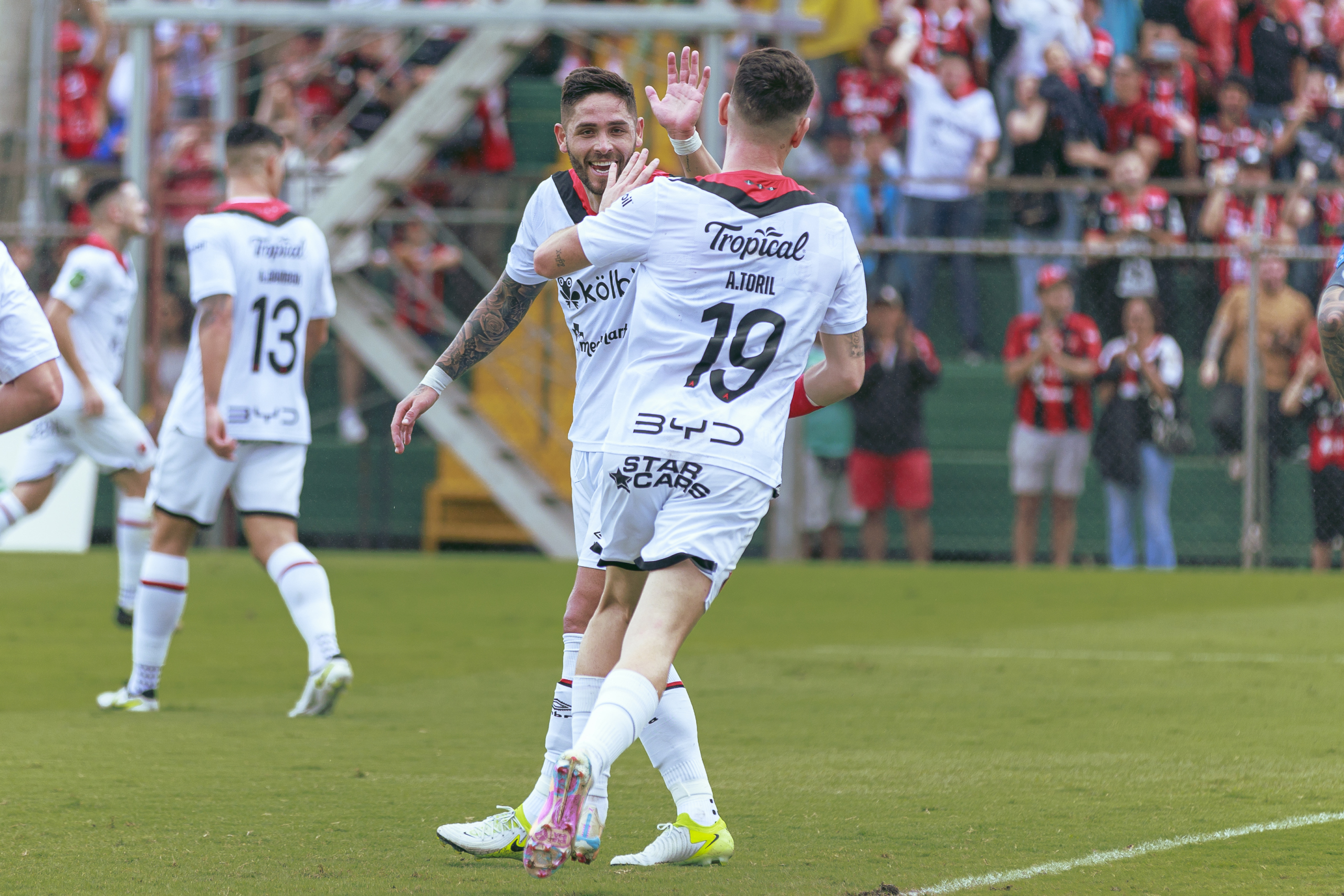 Tras la victoria de 0-2 en el Estadio de Piedades frente a Santa Ana, Alajuelense ya aseguró su lugar en la segunda fase del Apertura 2024. Fue la primera vez que LDA visitó el estadio del recién ascendido, donde finalmente los dirigidos por Guimaraes lograron llevarse los tres puntos a casa, tras un doblete del español Alberto Toril, quien mantiene una ardua lucha por el goleo y el puesto con Jonathan Moya, con quien ayer compartió por primera vez en cancha, y con quien celebró los dos tantos que sumó a su cuenta personal con la camiseta manuda. Tras un acertado cabezazo y luego, finalizando una jugada de pelota parada, Toril llegó a las seis anotaciones en el campeonato, y levantó la mano para recordar que tanto él, Moya, o al atacante que le toque asumir ese rol, está a puntita de pie para demostrar en cancha cuando así el cuerpo técnico lo considere.